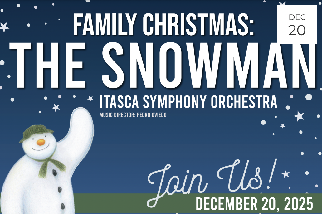 A heartwarming holiday tradition for the whole family! The Itasca Symphony Orchestra presents The Snowman, the beloved animated film based on the classic picture book by Raymond Briggs, with the film’s soundtrack performed live. Featuring Howard Blake’s enchanting score, including the timeless song “Walking in the Air” this performance brings the story of a boy and his magical snowman to life on the big screen. Join us for an unforgettable matinee of music, wonder, and holiday spirit.