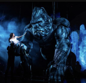 – Too large to fit in the wings of the theater, Kong was lifted above the stage by a 17-ton crane when not needed